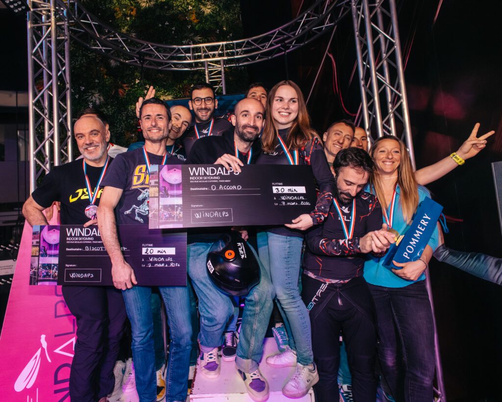 Cette flexibilité est indispensable. Avec les deux disciplines qu’il pratique aujourd’hui, Ludovic a besoin de temps. Pour la Wingsuit, il organise entre 200 et 250 entraînements par an. À cela s’ajoutent les séances de vol en soufflerie pour le vol relatif vertical. Avec « Biscotte 17 », ils se retrouvent tous les mardis soirs pour s’entraîner.